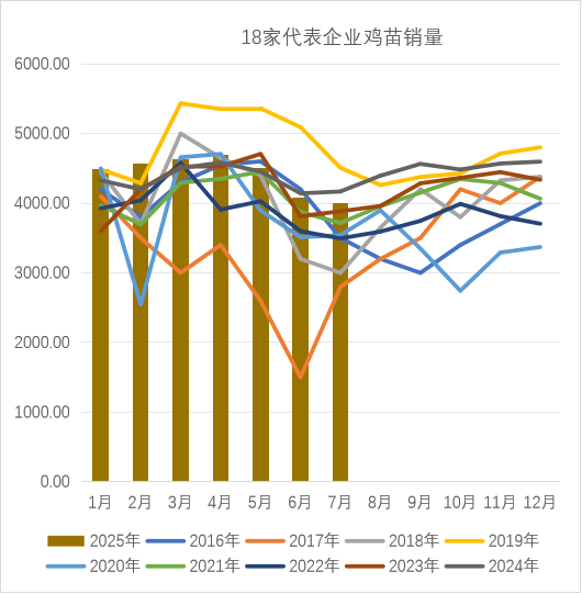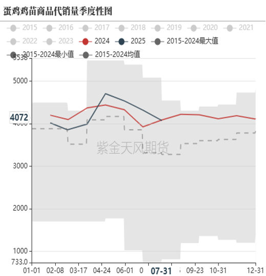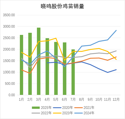 卓创数据显示全国2024年7月底鸡苗样本点销量3998万羽,环比减少1.9%,同比减幅4%;钢联数据显示,7月鸡苗销量4532万羽,环比减少4%,同比增加2.7%;晓鸣股份2025年7月销售1992万羽,环比减少18%,同比增加13%,三方机构及晓鸣股份鸡苗补栏量环比减少,补栏情绪大幅走低。目前种鸡企业鸡苗订单多数排至9月上中旬,少数排至9月下旬,从企业排单量以及补栏情绪来看,预期8月鸡苗销量环比减少。
