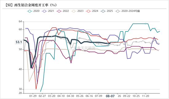 上周再生铝合金开工率环比+0个百分点至53.1%,原生铝合金开工率环比+1.0个百分点至55.6%