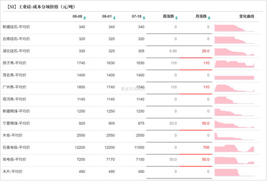 上周硅石、石油焦、硅煤价格周环比均有上调。