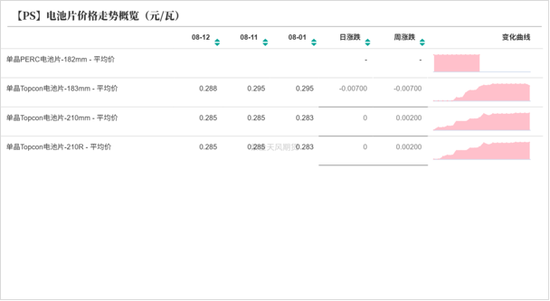 上周电池片部分型号价格拉涨。上周TOPCon电池片(183mm)价格环比-0.007至0.288元/瓦,TOPCon电池片(210mm)价格环比+0.002至0.285元/瓦。