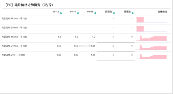 截至8月7日,硅片周产量为12.02GW,环比+1.02GW、9%;库存为19.11GW,环比+0.96GW、+5%。