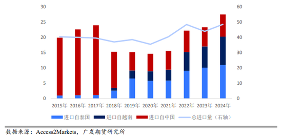 与此同时,欧盟在对华卡客车轮胎“双反”后,其卡客车轮胎进口格局发生巨大变化——泰国、越南成为承接中国卡客车轮胎出口的主要国家,与2017年相比,2024年欧盟自泰国、越南进口的卡客车轮胎增加了19万吨,而来自中国的卡客车轮胎下降了15.5万吨,表明欧盟自东南亚的进口量弥补了自中国的进口量,此外,2017年至2024年,欧盟卡客车轮胎进口量(欧盟CN编码40112090)从39.9万吨增长至48.4万吨,复合增长率达2.6%。