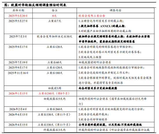 2025年7月初,欧盟发布消息称,初裁公布时间由2025年11月21日推迟至12月23日;初裁实施时间由2025年12月21日推迟至2026年1月21日;终裁实施时间由2026年6月19日推迟至7月18日。7月25日,欧盟委员会发布第2025/1538号实施条例,决定对来自中国的新充气橡胶轮胎(归类于CN编码40111011和40112010)实施强制性海关登记。此项登记自2025年7月29日起生效,并将持续9个月,在此期间,所有进入欧盟的涉案产品都将被海关记录,以便进行反倾销调查。