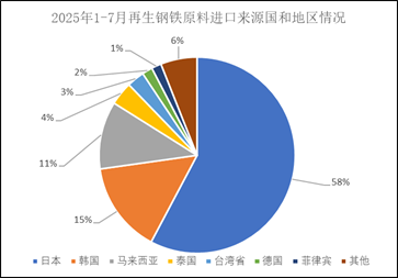 分国别和地区来看,2025年7月,从日本进口1.35万吨,占7月总进口量的62.08%,从韩国进口再生钢铁原料0.26万吨,占7月总进口量的12.00%。2025年1-7月从日本进口8.98万吨,占2025年总进口量的57.76%,从韩国进口再生钢铁原料2.33万吨,占2025年总进口量的15.00%。目前中国再生钢铁原料主要进口国仍然是日本和韩国。