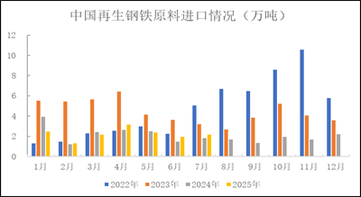 2025年7月进口再生钢铁原料2.17万吨,月环比增12.10%,年同比增20.03%。2025年1-7月再生钢铁原料累计进口15.55万吨,年同比降2.44%。