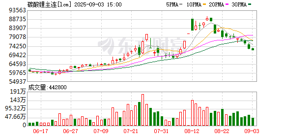 9月2日,碳酸锂期货主力合约大跌3.89%,持仓量增加8976手;9月3日,碳酸锂再跌3.10%,短短两周时间,碳酸锂期货价格从最高9万元/吨回落至7.2万元/吨,最新报71880元/吨。