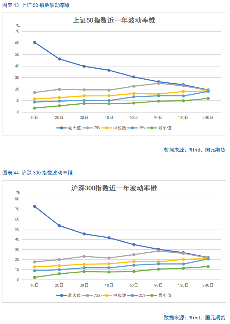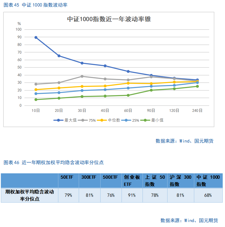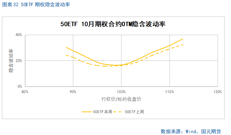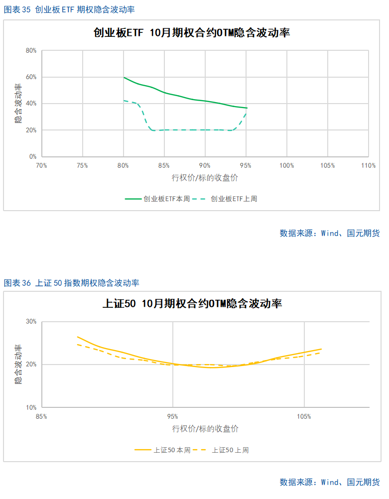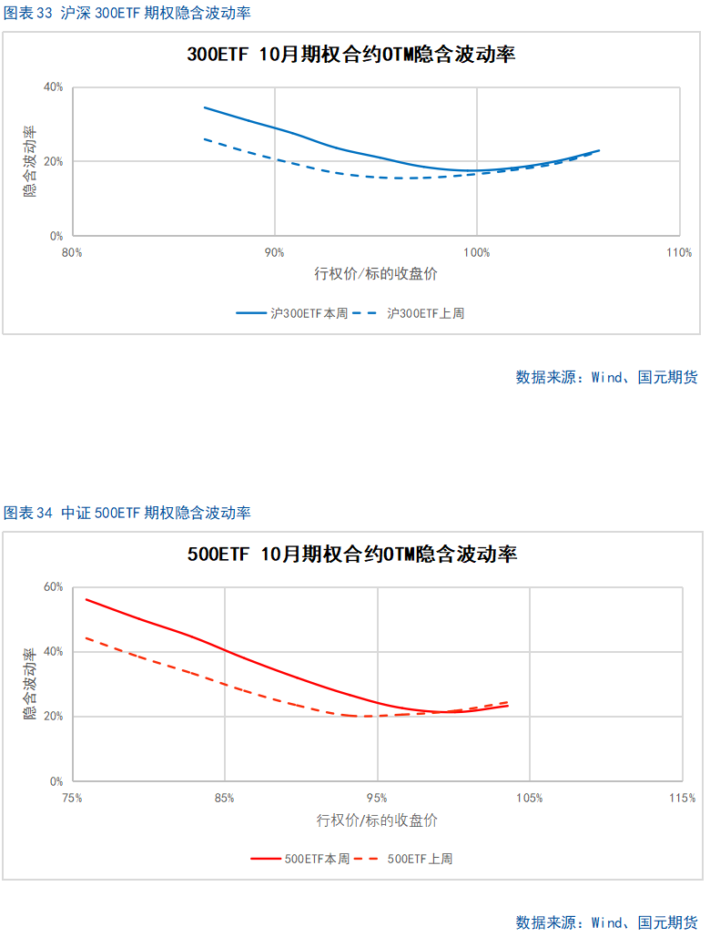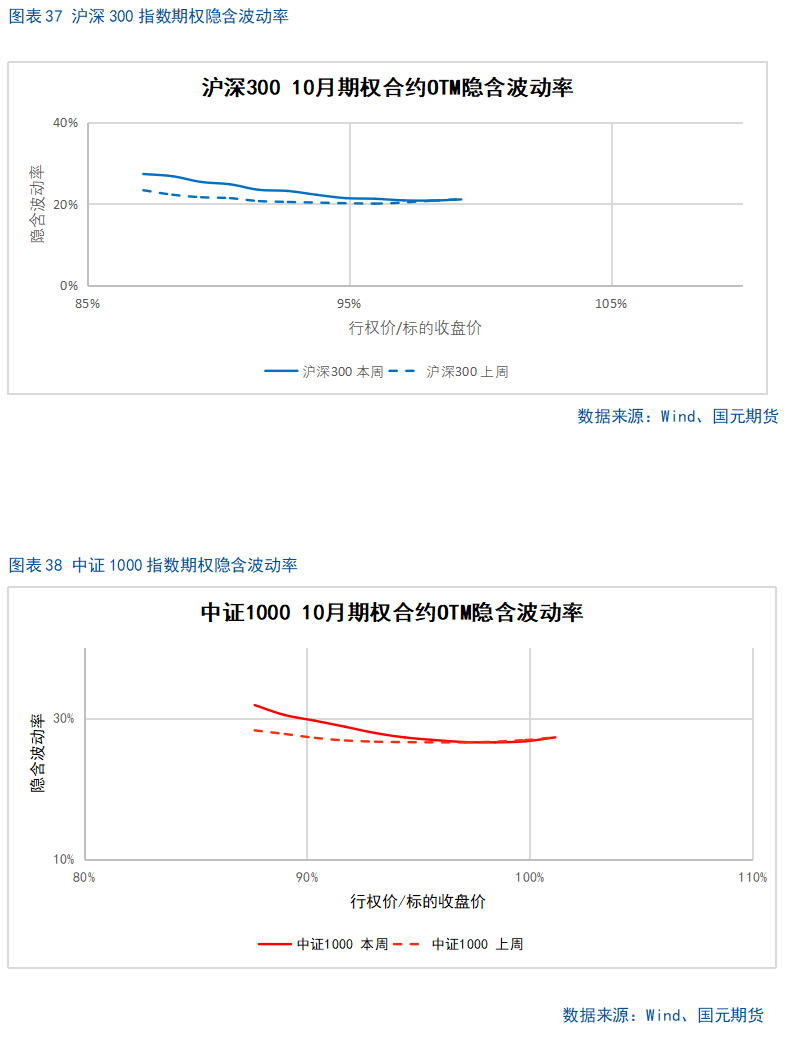 股指上周涨幅较大,期权加权平均隐含波动率整体维持在较高水平。当前各标的期权加权平均隐含波动率在19%-37%附近,整体处在近年较高水平。现货指数近两个月波动较大,市场对于股指大幅波动预期较高。