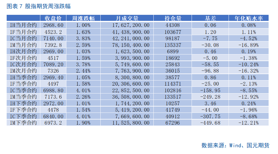 上周股指期货合约全线上涨,IC以及IM涨幅较大,中小盘再度获得市场青睐。近期IM以及IC贴水有所走扩,市场对于上涨持续性形成一定分歧。