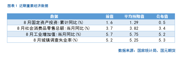 8月“投资—生产—消费—就业”四项核心指标全部低于一致预期且较前值回落,显示总需求与生产动能同步走弱,经济边际修复暂时受阻。与预期的偏差集中在固定资产投资与工业生产两个供给侧指标上,消费与就业的回落幅度较小但方向一致。