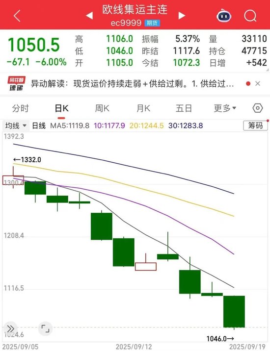 本周,集运指数(欧线)期货(下称集运指数)价格持续下行,截至周五收盘,主力合约大跌6%,至1050.5点,最近10个交易日已下跌20.13%。