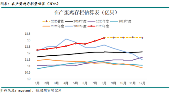 钢联数据显示,2025年8月份在产蛋鸡存栏环比继续增加,为13.17亿只,创近十年在产蛋鸡存栏新高,而根据理论新开产蛋鸡(4个月前补栏鸡苗)和理论淘汰鸡(17个月前补栏鸡苗)数量估算,今年11月份在产蛋鸡理论存栏预计才将触顶,整个四季度在产蛋鸡理论存栏量均在13亿只历史高位区间附近,后续新增开产蛋鸡数量预期仍较多,供应端压力仍将是拖累四季度鸡蛋价格下跌的主要因素。