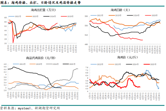 淘鸡方面来看,5-6月份淘鸡明显增多,但因新开产蛋鸡数量较多,6月份在产蛋鸡存栏环比仅小幅下降,而到了7月份,中旬鸡蛋现货价格反弹迅速,且后续有双节需求旺季支撑预期,市场淘鸡节奏环比明显减少;8月中旬开始,养殖端对旺季蛋价预期悲观,淘鸡情绪再度升温,9月份虽鸡蛋现货价格受季节性旺季提振接连反弹,但养殖获利时间仍较短,养殖端淘鸡情绪仅有短暂观望,随着蛋价触顶回落,养殖端淘鸡意愿再度升温,但目前淘鸡情绪距离超淘仍有较大距离,预计双节过后淘鸡情绪将明显增强。从淘鸡日龄数据上看,今年以来一路下降,目前淘鸡日龄已经降至500天以下,为近四年淘鸡日龄新低。