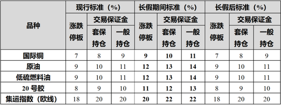 上海国际能源交易中心国庆节、中秋节期间相关品种涨跌停板幅度和交易保证金比例调整一览表