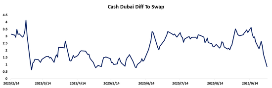 ⑷现迪拜对互换的溢价在9月迄今每月上涨52美分/桶,与预测一致。