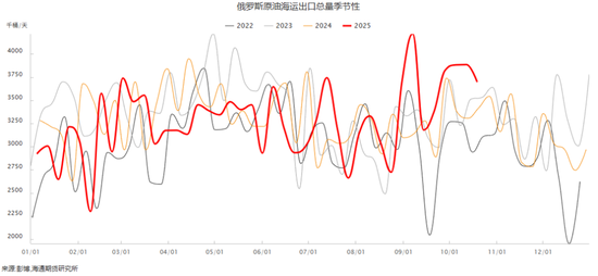根据俄罗斯价格指数中心(ЦЦИ)的分析报道称,2025年9月俄罗斯海运石油出口量较8月增长12.8%,其中ESPO(东西伯利亚-太平洋管道)原油出口量增幅达22.6%,至14.6万吨/日,创2025年以来最高水平;主要出口油种乌拉尔原油的海运量增长7.7%,至29万吨/日;在截至10月19日的四周内,俄罗斯海运原油出口量攀升至29个月新高,逼近2022年俄乌冲突爆发后的最高水平。机构船舶追踪数据显示,该国港口四周平均出口量达每日382万桶,较截至10月12日的数据增加8万桶,创下自2023年5月以来最高纪录。与波动较大的周度数据相比,四周平均值更能清晰反映潜在趋势。