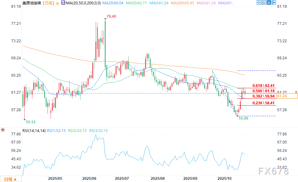 上周的反弹曾推动期货逼近突破位,但未能突破关键阻力位导致看涨动能停滞。若WTI原油能反弹并重新站上移动平均线,市场关注点可能重回近期高点62.59美元,并可能测试长期50%回调位63.74美元。