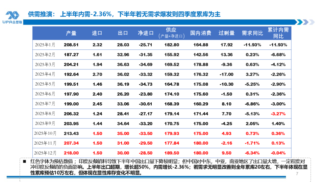 华南近传统银十的尾声;目前较好开工和订单相对较好的行业有墙板行业(spc板,炭晶板等),开工80-100%; 瓦片行业部分大厂有出口订单也能维持在80左右的开工水平,国内部分较好也能维持在40-50%的开工水平; 电缆造粒行业目前也有60-70%的开工;封边条、包材等中规中矩,开工维持70%左右。但整体情况偏弱. u2024年内需近持平。2025年上半年出口同比增加预计在50%以上,下半年出口或放缓。2025年若需求增速在3%以上,则全年紧平衡存阶段性去库的情况。但上半年内需增速在-2.36%左右,若非需求大爆发,下半年累库为主。但因出口可能达47%以上,下半年累库体现在显性库存上幅度可能不大。 |