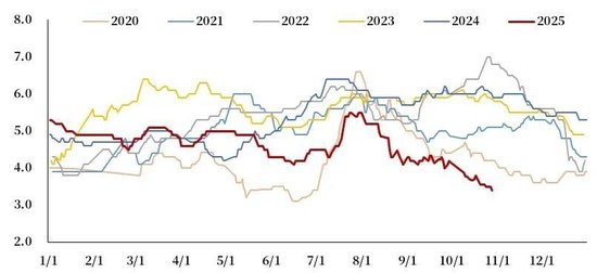 当前市场对淘鸡数据的解读存在一定分歧,从淘鸡日龄来看,近期延续下滑趋势,本周平均淘汰日龄在 493 天左右,较月初提前 7 天,但未出现断崖式下降,表明淘汰节奏相对平稳;从淘鸡出栏量来看,10月以来有明显增加,近两周平均出栏量较去年同期增幅接近20%,但持续时间稍显不足,且随着蛋价反弹后,淘汰进度有所放缓;而从淘鸡价格表现来看,超淘信号则更为显著,10月淘鸡价格下跌幅度超20%,呈现出明显的超跌特征。淘鸡量价之间的矛盾,使得短期市场难以判断是否已进入实质性超淘阶段,进而导致盘面合约定价出现分歧。