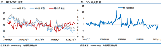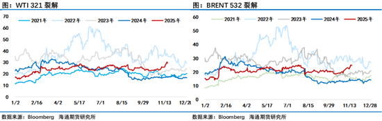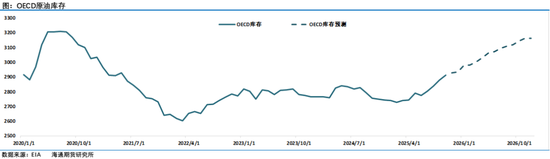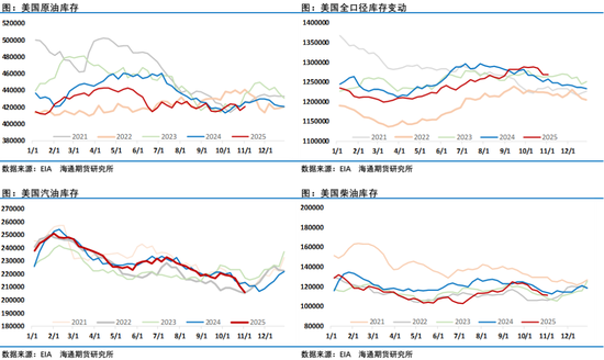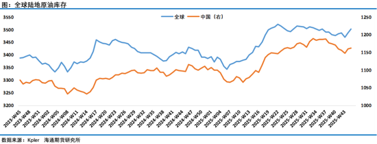 预测显示,全球液态燃料消费量在预测期内每日将增加110万桶。全球液态燃料消费量的增长几乎完全由非OECD国家驱动,这些国家在2025年每日增长120万桶,在2026年每日增长100万桶,而OECD国家的消费量在2025年每日减少10万桶,随后在2026年每日增加10万桶。非OECD国家的大部分增长集中在亚洲,其中相比2024年印度和中国的液态燃料消费量到2026年每日将增加超过40万桶。EIA强调对中国的需求预测仅包括最终消费,不包括库存增加,过去几个月来中国增加原油库存的行为一直成为市场关注的一个热点,因缺乏官方数据,各机构通过追踪的数据发现中国原油库存持续增长,在三季度有所回落之后,10月底开始中国原油库存再次回升,根据Kpler的高频数据过去二周时间全球原油陆地库存增加了3000万桶,其中中国增加了1400万桶。而目前水上原油仍维持在近年来高位,这部分水上库存一旦成为显性的陆地库存预计将继续给油价带来压力,目前来看市场对此也是高度警惕。考虑到对俄制裁及一些地缘因素给油价带来的不确定性,最终供应过剩压力程度如何计价是需要接下来一段时间持续跟踪的,这也是近期油价走势犹豫的一个因素。