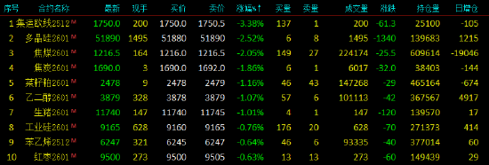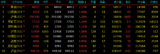 2025年11月12日,早盘开盘,国内期货主力合约涨跌不一。SC原油涨超2%,低硫燃料油(LU)涨近2%,铁矿、燃料油、沪锡涨超1%;跌幅方面,集运欧线跌超3%,多晶硅、焦煤跌超2%,焦炭跌近2%,生猪乙二醇(EG)、菜粕跌超1%。