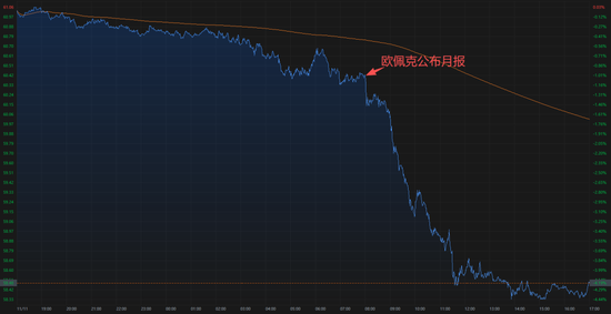 布伦特、SC原油也均跌超3%,这与金银铜的强势形成了鲜明对比。而就在前一交易日油价刚刚创了近三周来的最大单日涨幅,但周三下午开始油价开始回调地炼增大,随着晚间欧佩克公布了11月月报油价开始崩盘大跌,欧佩克在年末这个时间点终于承认了原油市场面临少量的过剩,这冲销了欧佩克产量下降的影响,盖过了其他利多因素,让油价走出了让人想象不到的突然暴跌。显然这不不仅仅是欧佩克月报的原因,但这绝对是一个让油价暴跌的导火索,此前欧佩克一致强调市场健康,需求良好,后市展望稳定,但随着其观点的调整,让市场情绪反应过度,累积的利空担忧情绪充分宣泄,油价出现了无抵抗的单日暴跌。