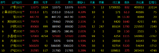 2025年12月1日,早盘开盘,国内期货主力合约涨多跌少,沪银涨超6%,集运欧线涨超4%,铂涨超3%,国际铜涨超2%,跌幅方面,纯碱、氧化铝跌近2%,烧碱、玻璃跌超1%。