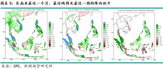 当前全球气候有弱拉尼娜迹象,NINO3.4周度指数截止11月23日已经跌至-0.93。美国气候预测中心(CPC)预估,弱拉尼娜现象将持续至北半球冬季,有可能2026年1月至3月过渡为ENSO中性状态(61%概率)。