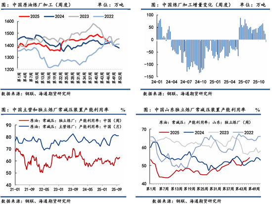 总量上来看,2025年1-11 月中国主营和独立炼厂累计加工6.8亿吨,同比增长0.07%,基本持平于去年。常减压下主营炼厂维稳在70-80%附近的开工率,地炼开工率则保持在55%-60%之间,且相对过往年份来看其开工季节性下降明显,这也受国内终端消费不足与炼油毛利滑落因素所影响,同时也受今年欧美更为加紧制裁非法油运输以及制裁国内油运码头等外部扰动影响。