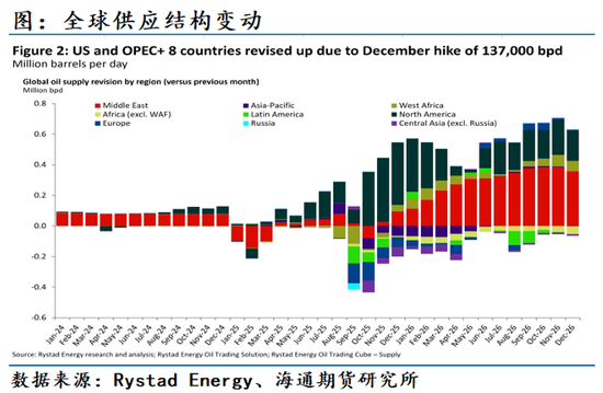 11月30日欧佩克召开了第40届欧佩克和非欧佩克产油国部长级会议,在随后发表的声明中强调鉴于欧佩克和非欧佩克参与国在《合作宣言》(DoC)中持续承诺实现并维持稳定的石油市场,重申第38届OPEC和非OPEC部长级会议商定的《合作宣言》中OPEC和非OPEC参与国的原油总产量水平将持续至2026年12月31日。8个额外自愿调整产量欧佩克+国家——即沙特阿拉伯、俄罗斯、伊拉克、阿联酋、科威特、哈萨克斯坦、阿尔及利亚和阿曼——于2025年11月30日举行视频会议,评估全球市场状况和前景。重申因季节性因素暂停2026年1月、2月及3月的产量增量的决定。并称根据不断变化的市场状况,可能会部分或全部恢复每日165万桶的产量,且将以渐进方式进行。各国将继续密切关注和评估市场状况,并在持续努力支持市场稳定之际,重申采取谨慎态度并保持充分灵活性的重要性,以便继续暂停或逆转额外自愿减产措施。如果按照这一计划,欧佩克+将在当前产量基础上,在2026年至多给市场带来51万桶/日的增量,如果根据其增产节奏按年均产量来看,较2025年会有一个明显的大幅增加超200万桶的日增量。另外根据三方机构睿咨得判断基于当前油价,以巴西、美国、加拿大和挪威为首的非欧佩克产油国预计将在2026年增加115万桶/日的原油和凝析油,正是这些增量让各大机构基本对整个2026年维持了超过200万桶/日过剩的基本判断。