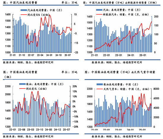 ①对于汽油:受新能源车替代强劲影响。尽管节假日出行频次增多有带动作用,且夏季汽油车载空调增加,但都难以弥补新能源车形成的替代冲击。据隆众数据,2025年1-10月,国内汽油表观消费累计达 1.3 亿吨,同比增速-5.1%。反观新能源车反而持续渗透,大幅削弱燃油车市场份额。中汽协统计,2024年1-10月,新能源车销售量累计达1291万辆,同比增长32%,新能源车渗透率从2017年仅2%持续上升至超50%,而传统燃油车渗透率则从98%持续下滑至50%以下。