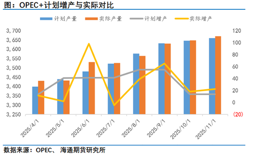 OPEC 在从2025年3月份OPEC+会议公布后,其计划开始从4月起每个月开始回补之前减产额度,回补期间为2025年4月至2026年9月,但我们结合实际来看,OPEC+在2025年9月前加上阿联酋必要增产30万桶/天,实则在回补计划层面就已经满足了原本在26年9月才会最终结束的联合减产回补计划。 如果我们从产量规划的角度来看,也可以看出在OPEC+3月份给予最初的产量规划,和我们统计下来每个月调整的产量规划也有出入。