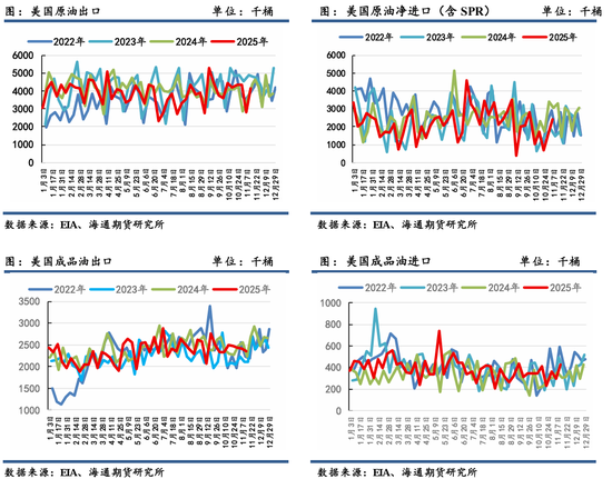 美国是全球最大的成品油消费大国,其消费高峰一般聚集在将士阵亡日期间的暑假出行带动。据EIA 数据显示,截止11月14日,2025全年美国汽油、柴油、航空煤油平均需求分别为878、380、171 万桶/天,同比变化+0.9%、+0.2%、+3.6%,消费增量主要来源于航煤需求,汽柴需求量相对稳健。整体来看,美国自身成品油需求仍具有韧性,也即对应炼厂要维持相对高开工率以满足国内油品需求。