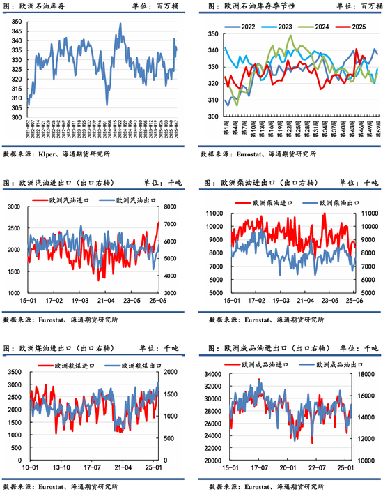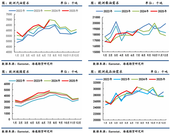 据Eurostat 官方数据最新录得2025年1-7月,欧洲炼厂原油加工量为2.73亿吨,较去年同期2.82亿吨回落3.2%;且上半年进口量基本弱于去年,主要由于欧洲经济相对不景气,炼厂检修产能增加。另外,对于欧洲的成品油需求来看,整体汽柴煤总需求较去年改善明显。前1-7个月,欧洲成品油需求为1.95亿吨,较去年同期1.93亿吨增长1%。整体欧洲的需求仍主要由德国拉动,德国基础设施支出有望延续地区经济增长动能,进而推动石油需求。