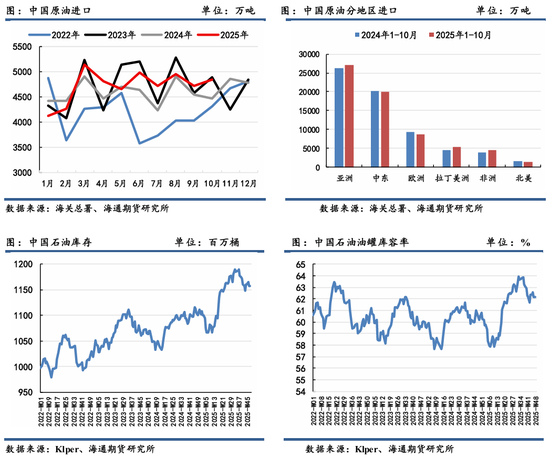 今年以来,受关税政策、地缘冲突、产油国政策博弈、制裁风波等因素影响,国内原油囤积进口的力度仍较强,尤其是下半年的战略储备。海关数据显示,2025年1-10月原油累计进口量达到4.71亿吨,较去年同期增长3.05%,进口来源依旧以中东为主,但进口增量相较去年同期减少,其更多转向亚太、南美、非洲进口替代。同时受中美关税争端影响,1-10月自美国进口量较去年同期减少73%,占比份额进一步下降至0.5%以下。