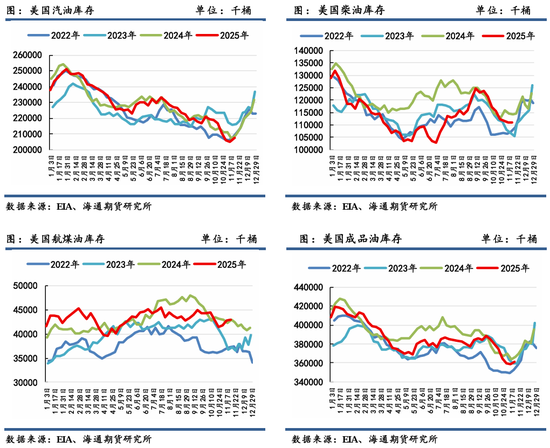 欧洲石油库存在下半年出现反季节性增加,主要由于欧盟第18轮制裁拟于2026年1月全面升级对俄罗斯生产的燃料贸易限制,使得欧洲市场成品油供应紧张,尤为是柴油市场,这也在下半年期间欧洲柴油裂解价差出现大幅上涨迹象中可以得到体现,也可在8月份印度对欧洲创纪录出口柴油中得到验证。今年欧洲累积的石油库存压力大,也即柴油裂解利润可观下,炼厂柴油生产积极性高,如若库存增速快于需求增速,也将使得欧洲柴油紧张局势缓和,进而使得裂解差回落。