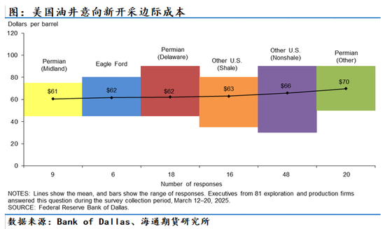 ①产区原油新开采意向成本。根据达拉斯联储数据所示,二叠纪(特拉华和米德兰)地区的生产经营成本分别在33和35美元/桶;而二叠纪(其他)地区的生产经营成本在45美元/桶左右;鹰伏特生成经营成本处于26美元/桶的最低位。