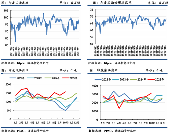 印度是原油进口国和成品油净出口国。原油进口方面,超80%的原油进口来自中东和俄罗斯。今年1-10 月份,累计进口原油2.06亿吨,较去年同期2.01亿吨增加。不过今年8月份以来,由于欧美加强制裁俄罗斯石油出口,且特朗普表示因印度采买俄油行为而对印度加征50%的关税,迫于关税压力下,印度自俄罗斯进口原油更为谨慎,转而向中东市场进行填补,包括印度最大的炼油商信实工业也据悉将停购俄石油。