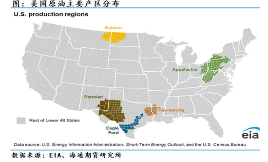对于整体产量更为直观的是原油价格对于原油边际成本的影响,美国页岩油主要产区根据EIA的划分,可共分为五大产区分别是二叠纪(Permian)、贝肯(Bakken)、鹰伏特(Eagle Ford)、阿巴拉契亚(Appalachia)以及海恩斯维尔(Haynesville)。