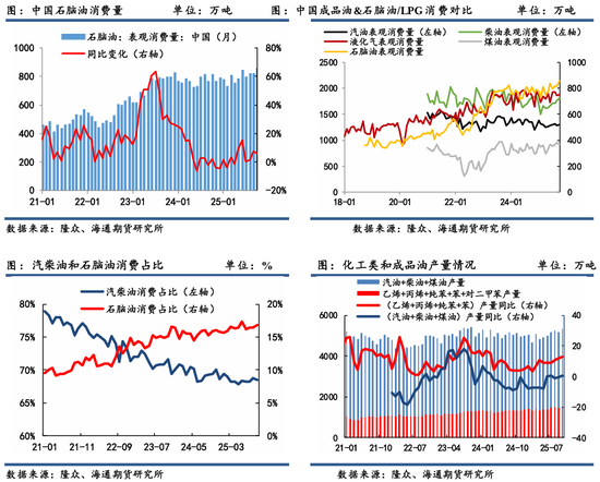 另外,从石脑油消费程度来看,2025年1-10月国内石脑油表观消费量达到7969万吨,同比增速3.7%,呈现逐年上涨迹象。石脑油的需求与化工产品息息相关,特别是芳烃和烯烃链条。近两年来,由于受原油轻质化影响,主营及地方炼厂重整装置产能增加,尤为是恒力石化、浙江石化等装置相继投产,使得用于重整装置生产的石脑油用量占比增加。目前石脑油消费市场份额逐步提升至 15%以上,反映了中国石油消费从“燃料型”向“化工型”转型。随着我国炼油能力不断提升和石脑油下游市场需求持续释放,未来石脑油消费或在汽柴消费增速放缓背景下或实现托底需求增量支撑。