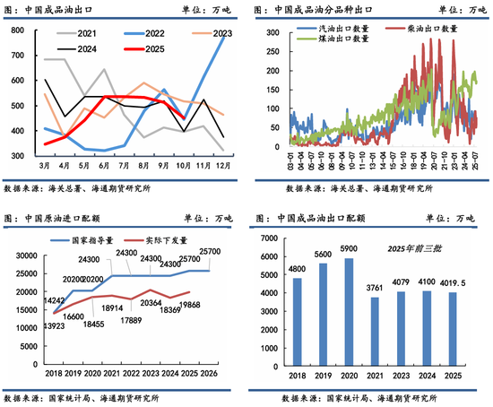 另外配额方面,近期国内也下发了2026年的原油进口配额,2026年指导下发量为2.57亿吨,其中2026年第一批配额进口总量773万吨,同比增加28%,将为后续原油进口提供窗口。成品油出口配额方面,2025年前3批成品油出口配额下放至4019.5万吨,其中航煤在成品油出口配额中占比偏多。在海外汽柴裂解利润欠佳下,国内汽柴油出口量低,炼厂出口转内销更进一步增加汽柴资源过剩。而航煤油出口上涨明显,也仅只是给予的出口配额占比偏高,炼厂最大化利用出口配额。