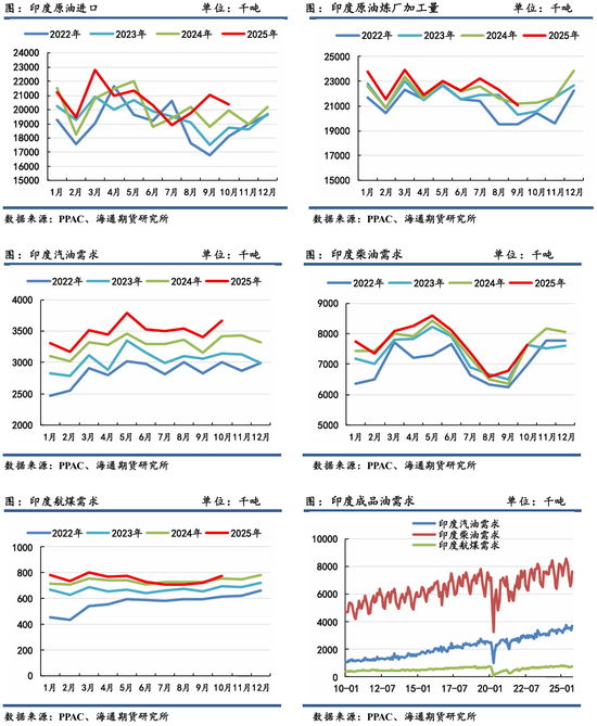 印度是全球第三大石油消费国。从PPAC公布的加工量和进口量数据来看,年内印度原油需求相对稳定增长,成为亚洲地区原油需求增长的重要引擎。2025 年1-9 月,印度炼厂加工量累计为2亿吨,同比增速2%;累计进口1.9亿吨,同比增长2%,占其需求量的90%以上。印度在本财年4-6月取得7.8%的 GDP 增速,创下 5 个季度以来最快水平。印度国内经济的兴起有利于推动能源化工需求,而这从印度的汽柴煤需求指标中也可以得到印证。2025年1-10月印度汽油需求平均为348.4万吨,同比+6.5%;柴油需求平均为764.6万吨,同比+2.3%;航煤需求平均为75.1万吨,同比+3.0%。