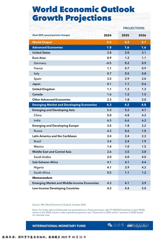 10 月14日,国际货币基金组织(IMF)在世行和IMF年会期间发布《世界经济展望报告》。与 7 月预测值相比,新一期报告对中国今年经济增速4.8%的预测维持不变。全球经济增速将从2024年 的3.3%放缓至2025年的3.2%,2026年将进一步降至3.1%。其中,发达经济体的增速约为1.5%,新兴市场与发展中经济体增速略高于4%。预计美国今明两年经济增速分别为2%和2.1%,较7月预测值上调0.1个百分点。随着世界各国适应日益加剧的贸易保护主义和碎片化格局,中国的GDP预计在2025年增长4.8%,2026年增长4.2%,与4月份报告相比分别增加0.8和0.2个百分点,凸显了我国经济发展的巨大韧性和增长潜力。报告称,由于各方协议及政策调整,部分极端高关税情况有所缓和,但整体环境仍不稳。