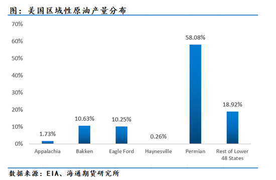 从五大产区量级的角度来看,采用今年1月至10月EIA公布的官方数据,最主要的产量还是存在于二叠纪盆地(Permian)(58.08%),但鹰伏特页岩区(Eagle Ford)、巴肯(Bakken)地层也分别占了美国约10.25%和10.63%的产量比例,综合来看CR3合计约占78.96%。