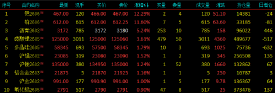 2026年1月5日,早盘开盘,国内期货主力合约涨多跌少,钯涨超12%,铂涨超11%,沥青涨超5%,碳酸锂涨超3%,多晶硅、沪铝沪镍、铝合金涨超1%。跌幅方面,烧碱、低硫燃料油菜粕跌超1%。