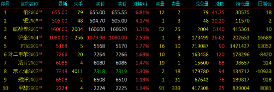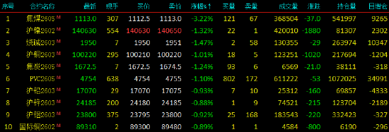 2026年1月21日,早盘开盘,国内期货主力合约涨跌不一。铂涨超6%,钯涨超4%,碳酸锂涨超3%,沪金涨超2%,PTA涨近2%,PX、燃油、苯乙烯(EB)、甲醇、瓶片、低硫燃料油(LU)涨超1%;跌幅方面,焦煤跌超3%,烧碱、焦炭、聚氯乙烯(PVC)跌超1%。