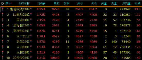 早盘收盘,国内期货主力合约涨多跌少,集运指数(欧线)涨超4%,低硫燃料油(LU)、尿素、菜粕涨超2%,菜油、豆二涨近2%。跌幅方面,纯碱跌近4%,玻璃跌超3%,碳酸锂跌超2%,焦煤跌近2%。