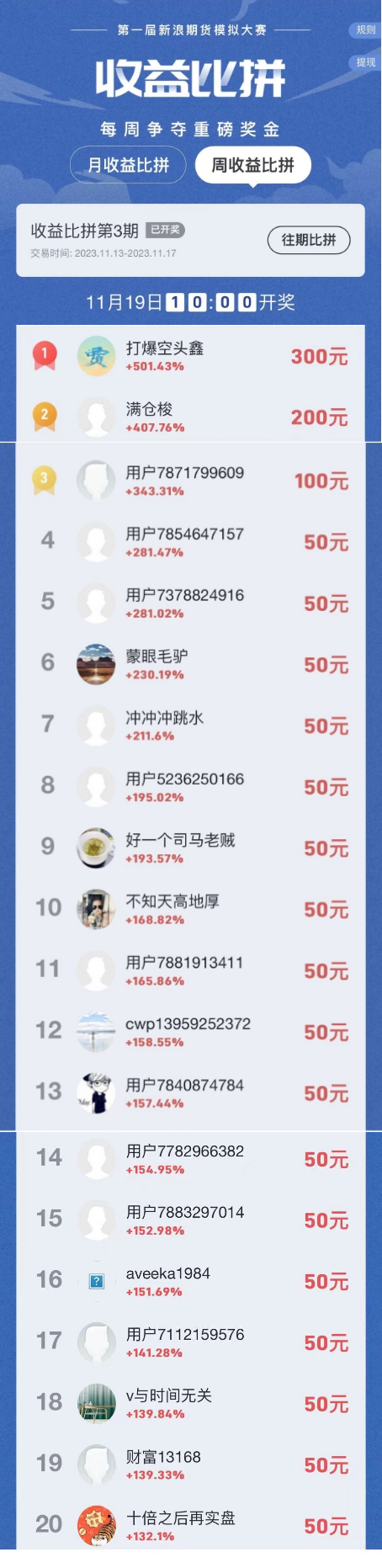 领奖方式可在微博话题 #第一届新浪期货模拟大赛#置顶位 或比赛首页下方找到。