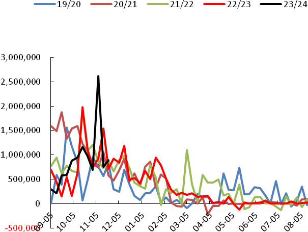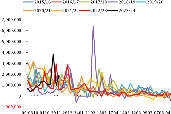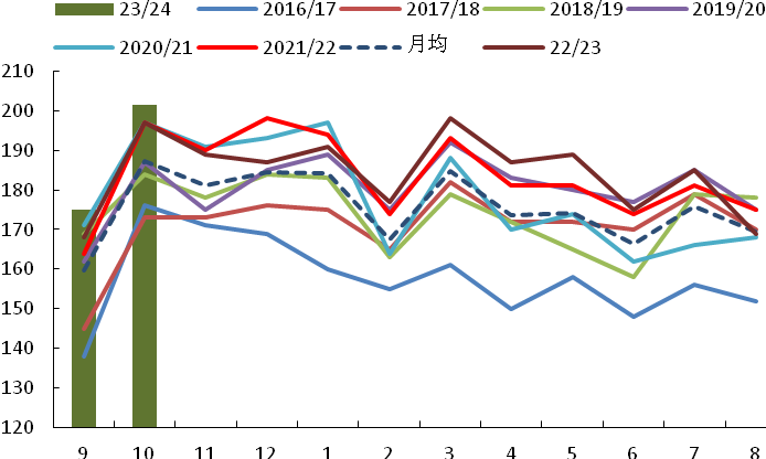 2023年11月初,中国在进博会采购大量美国大豆。USDA周度销售报告显示,11月9日当周美豆销售达到385万吨,其中净销售到中国261万吨,均处于历史同期偏高水平。截至11月23日,2023/2024年度美国大豆累计销售3095万吨,完成整个作物年度出口目标4776万吨的62%。最近几年中,元旦前当季美国大豆累计净销售量会达到全部出口的80%左右(整个作物年度累计净销售量和全部出口量差额在±100万吨以内),也就是3802万吨,目前还差848万吨。距离元旦还有6周左右时间,平均每周需要销售140万吨附近。然而,美豆收获上市以来,2023/2024年度平均销售130万吨上下,因此暂时全年的出口目标还是很有可能完成的,短期美豆出口目标不会调整。