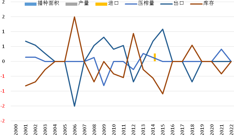 图1:USDA历年12月报告中种植面积、产量、进口、压榨量、出口和库存调整情况(百万英亩、百万吨)