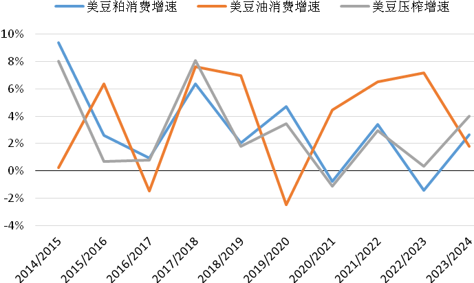 图5:美国大豆压榨、豆粕和豆油消费增速(%)